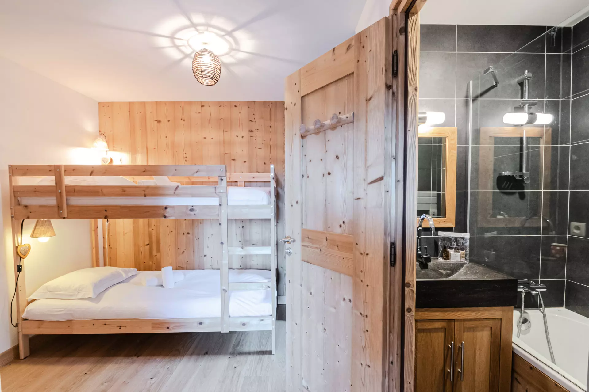 - Chambre famille avec un lit double 140x190, un coin nuit pour les enfants avec des lits superposés et salle de bains particulière