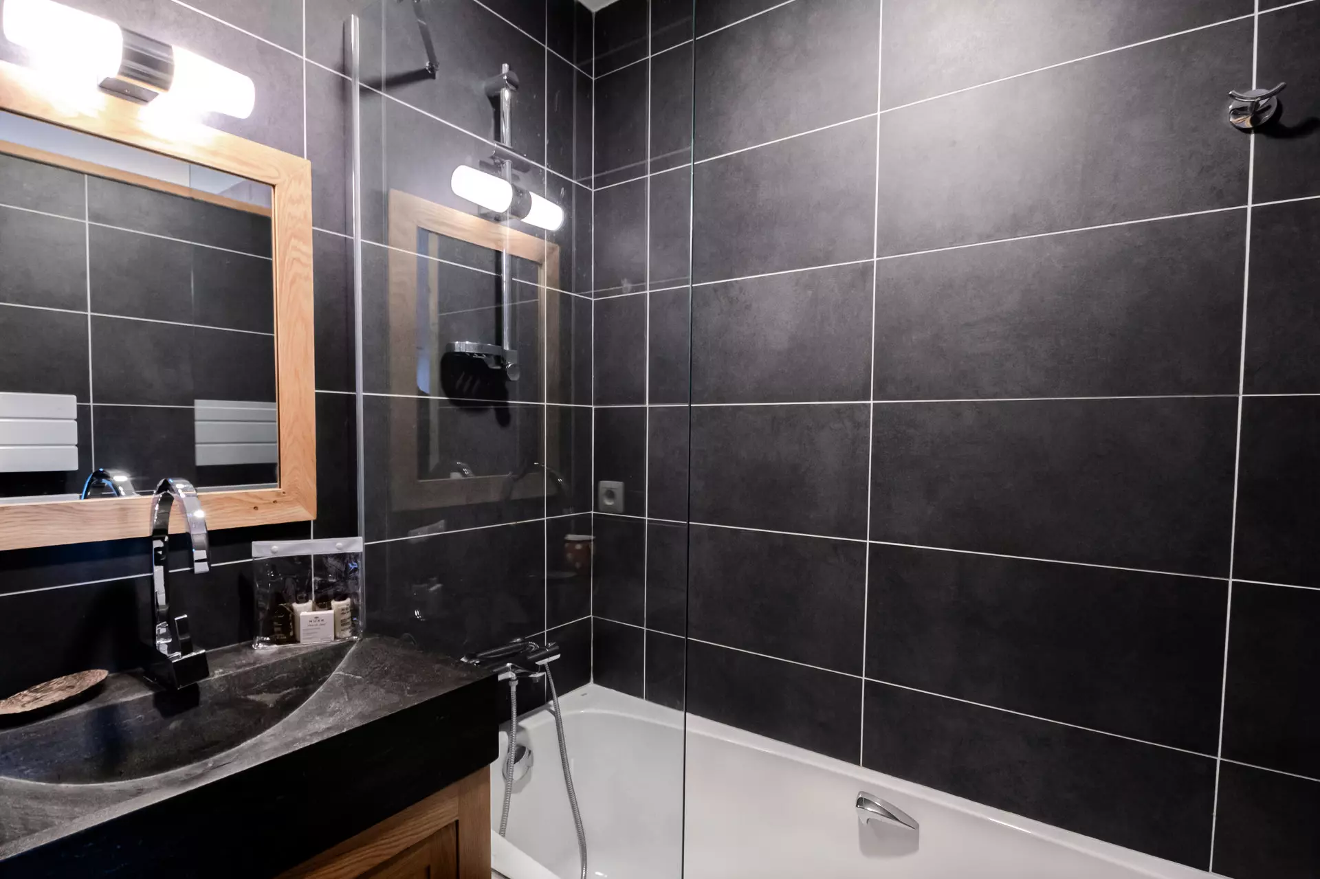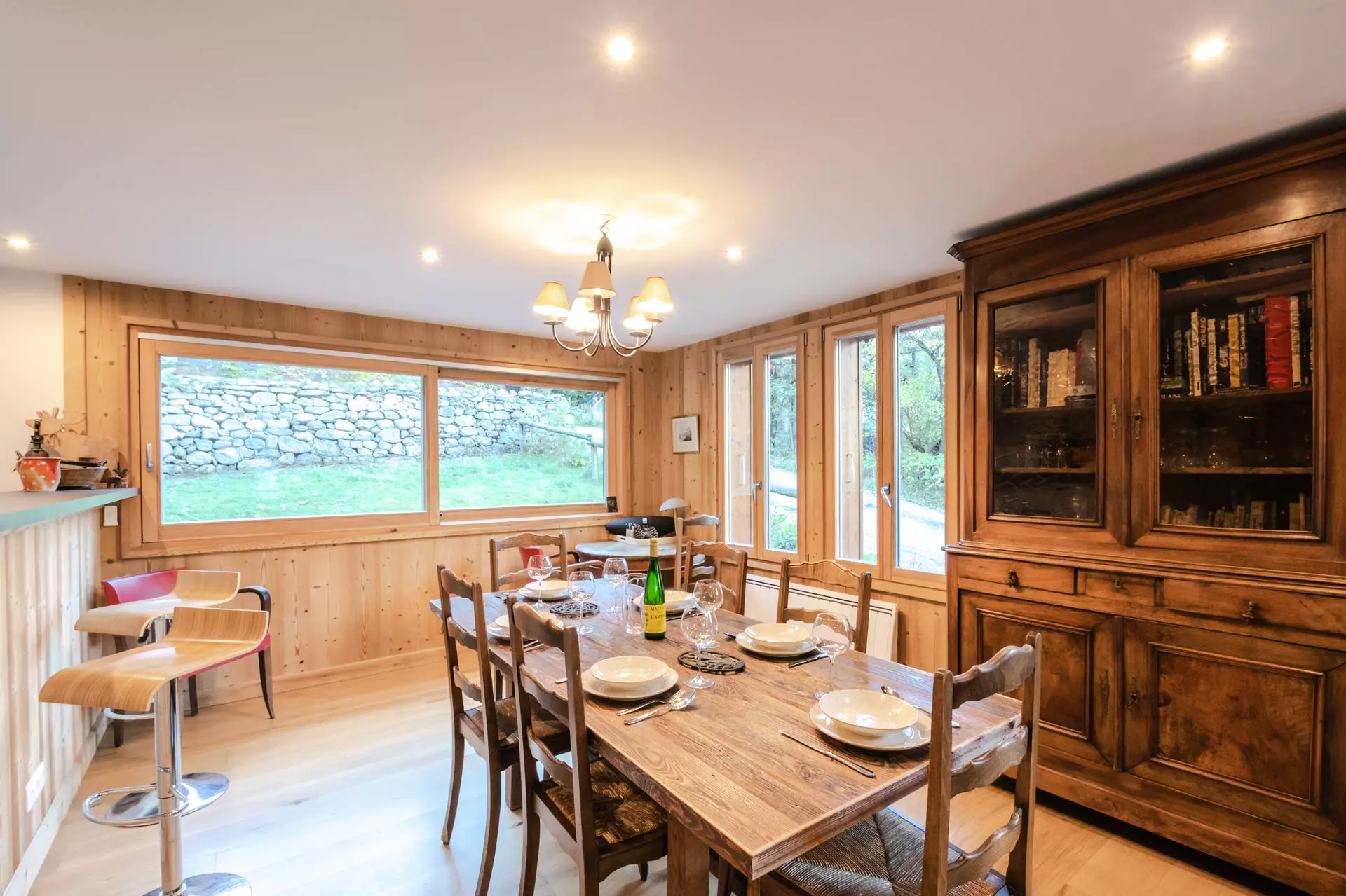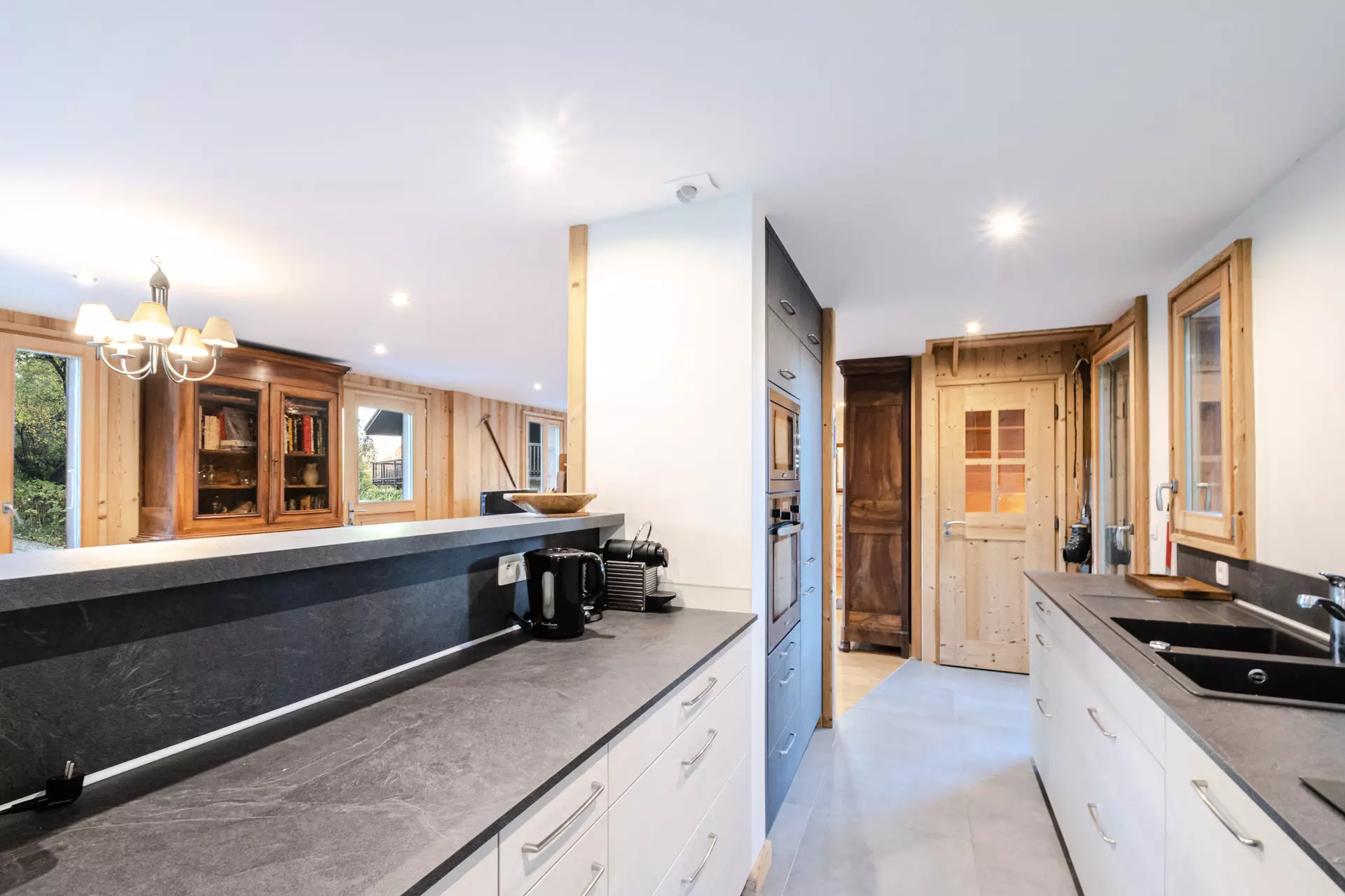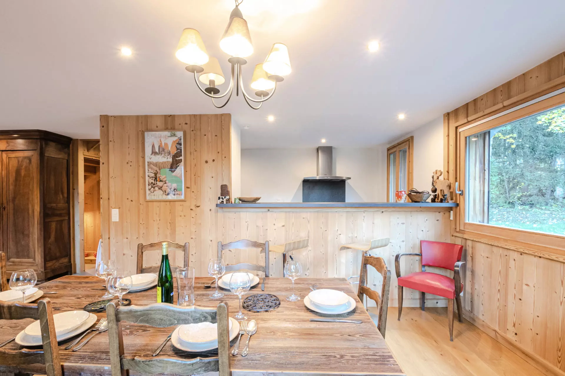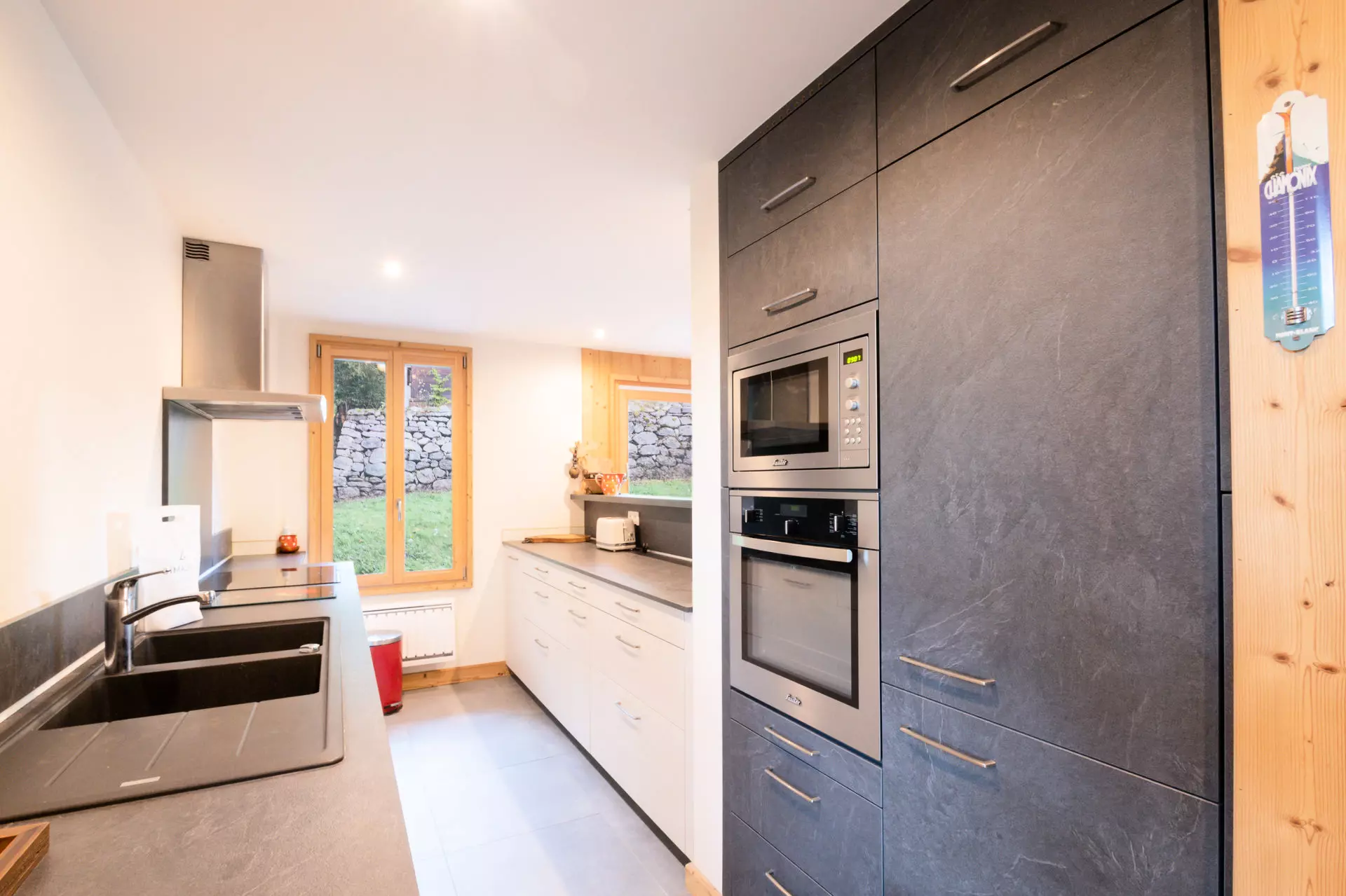 Equipements : réfrigérateur, congélateur, four, micro-ondes, lave-vaisselle, plaques à induction 3 feux, hotte, Nespresso, bouilloire, appareil à fondue, appareil à raclette traditionnel (sans coupelles).