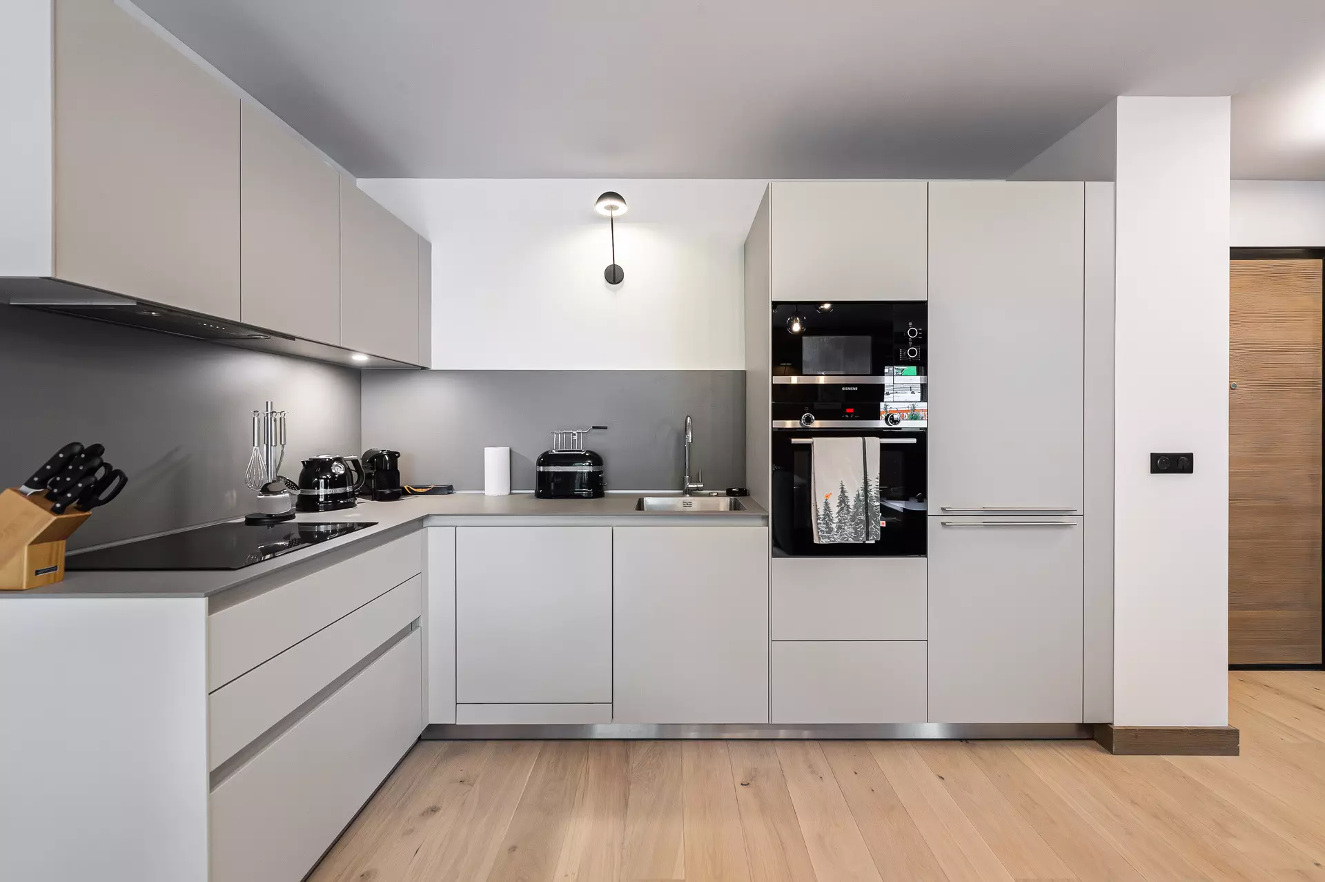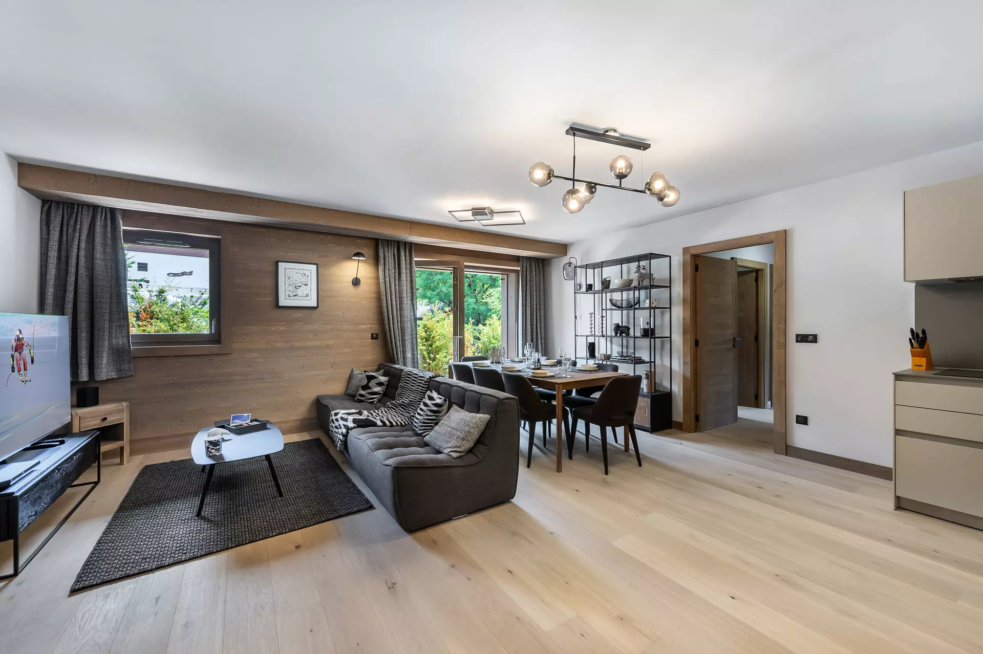 Appartement de 83 m² situé dans le quartier calme de Rochebrune, à 15-20 minutes à pied du centre de Megève et à moins de 10 minutes des remontées mécaniques. Il accueille confortablement 6 adultes en chambres doubles et 2 enfants en lits superposés. La pièce de vie lumineuse s'ouvre sur un large balcon avec vue sur la vallée de Praz-sur-Arly, idéal pour profiter du soleil en fin de journée. L'espace salle à manger, avec sa grande table en bois, favorise la convivialité, tandis que le grand canapé invite à la détente.