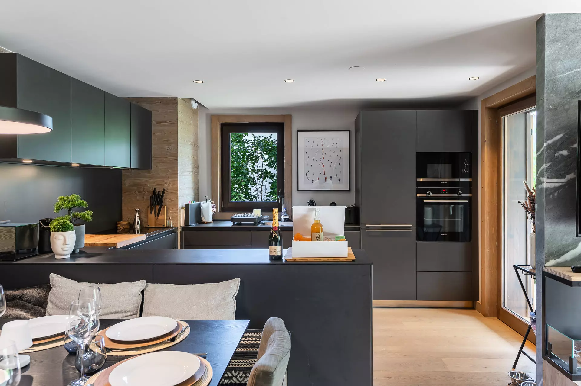 - Pièce de vie : Cuisine ouverte, espace repas pour 12 personnes, salon TV avec cheminée à l'éthanol