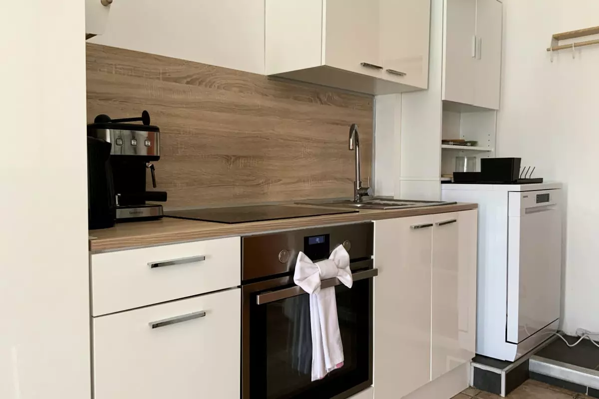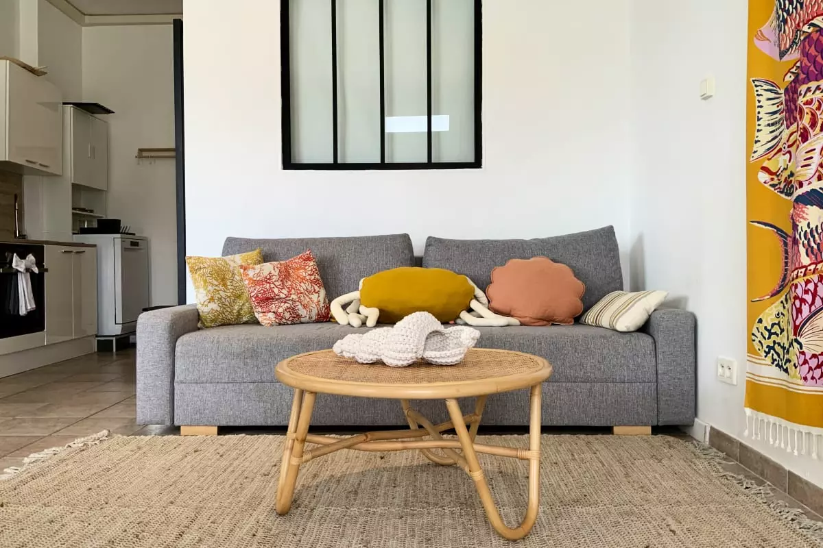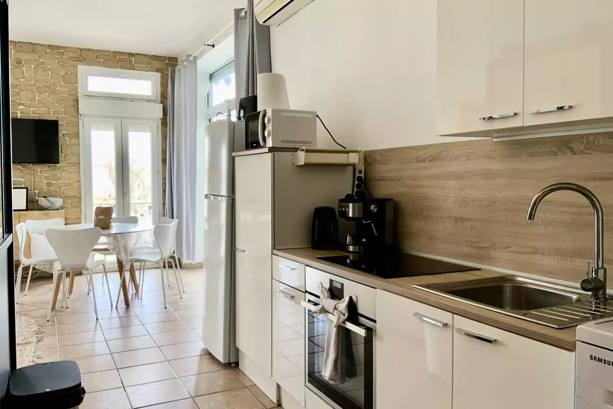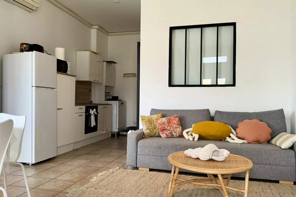 La cuisine, ouverte sur la pièce de vie, est entièrement équipée : machine à café, grille-pain, bouilloire, etc. Un coin salon avec télévision et un canapé convertible complètent cet espace convivial. L'appartement est également doté de la climatisation pour votre confort.