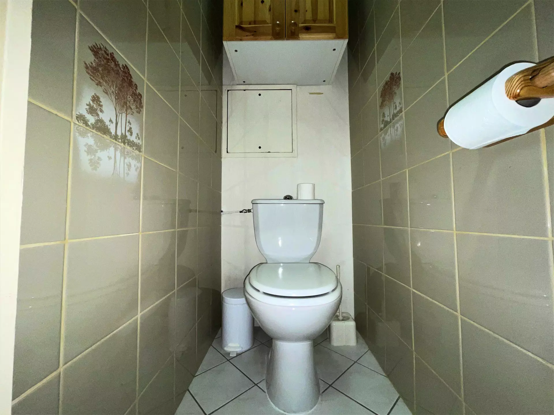 Salle de bains : lavabo, douche, toilettes, sèche serviette