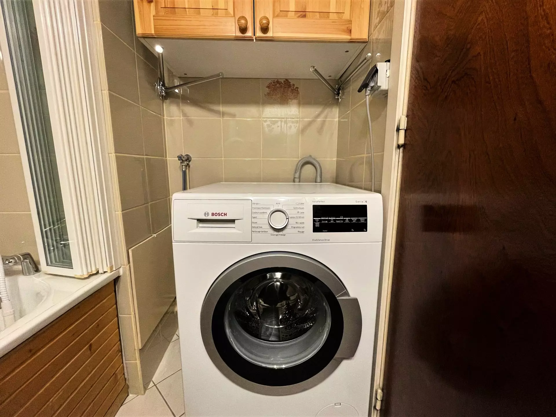 Salle de bains : lavabo, baignoire, lave-linge, sèche serviette