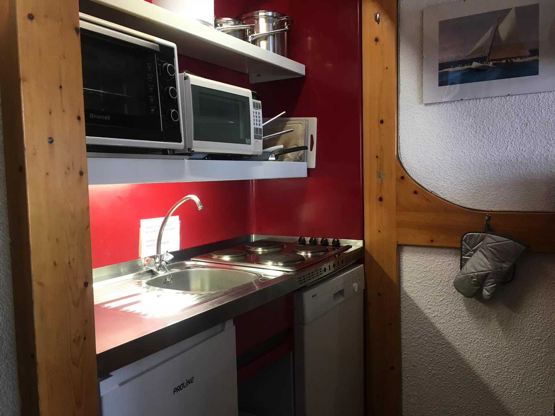 La kitchenette est équipée de 2 plaques vitrocéramiques, d'un four micro-onde, d'une cafetière éléctrique, d'une bouilloire et d'un grille-pain.
