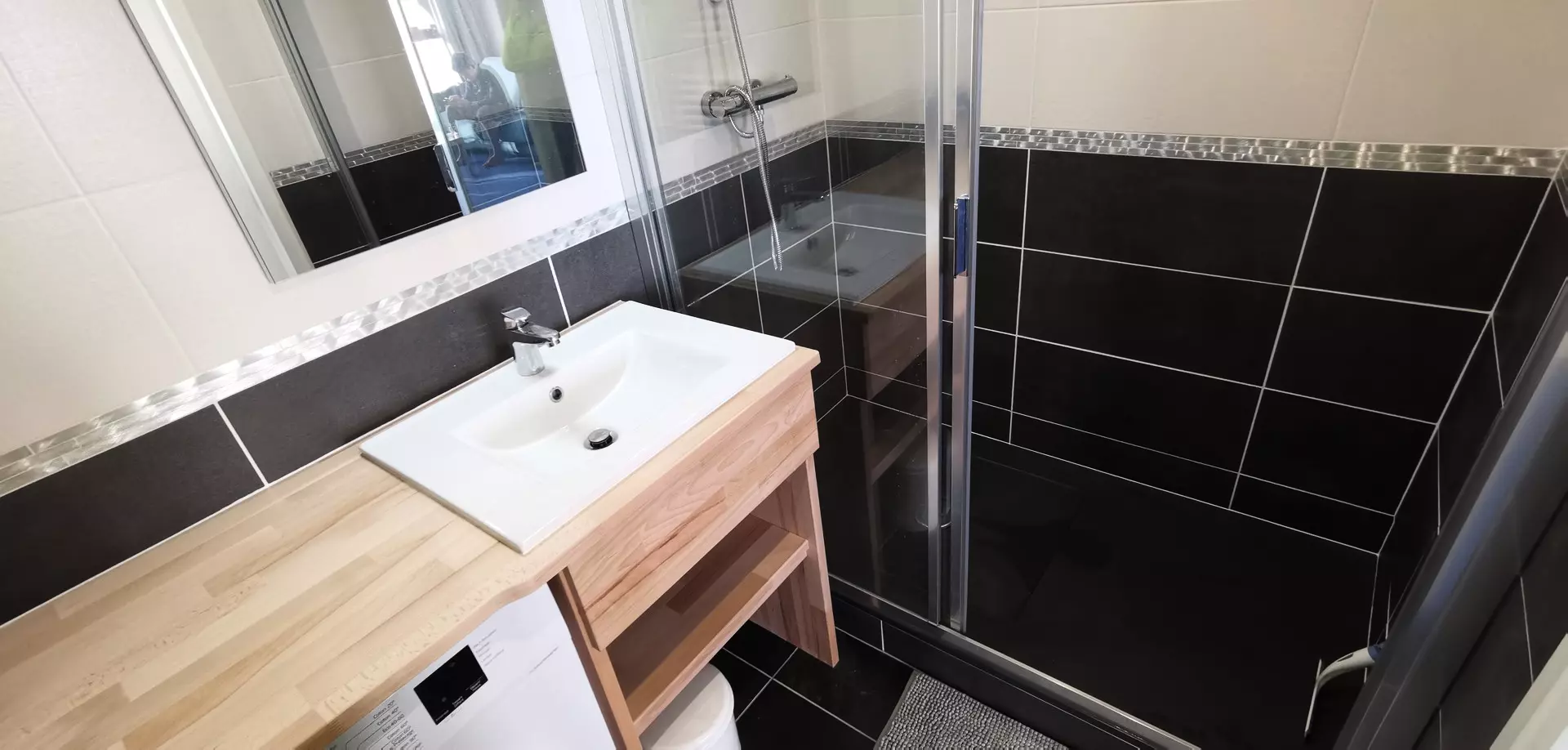 La salle de bain dispose d'une douche à l'italienne et les toilettes sont séparées.