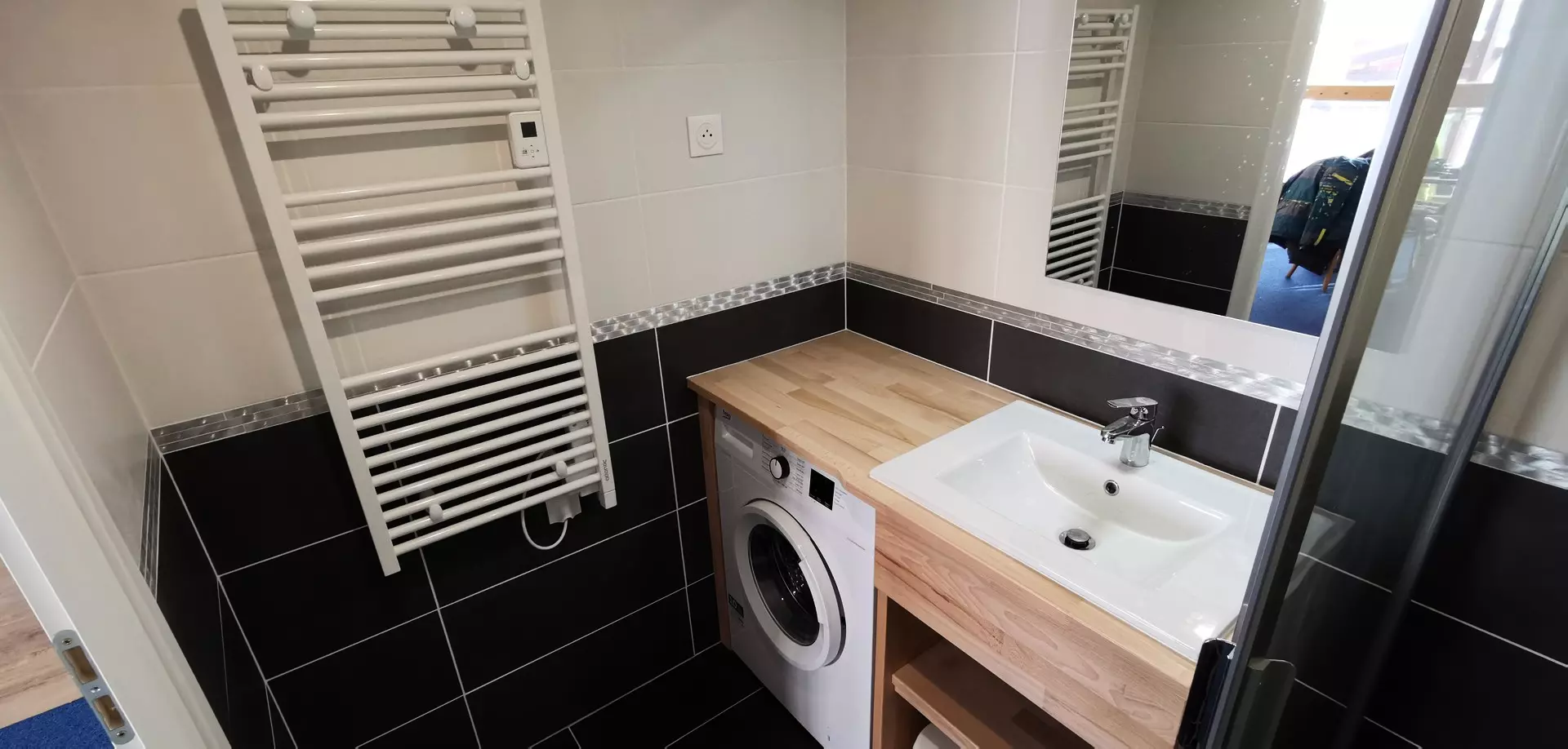 Les toilettes sont séparées de la salle de douche avec lave linge.