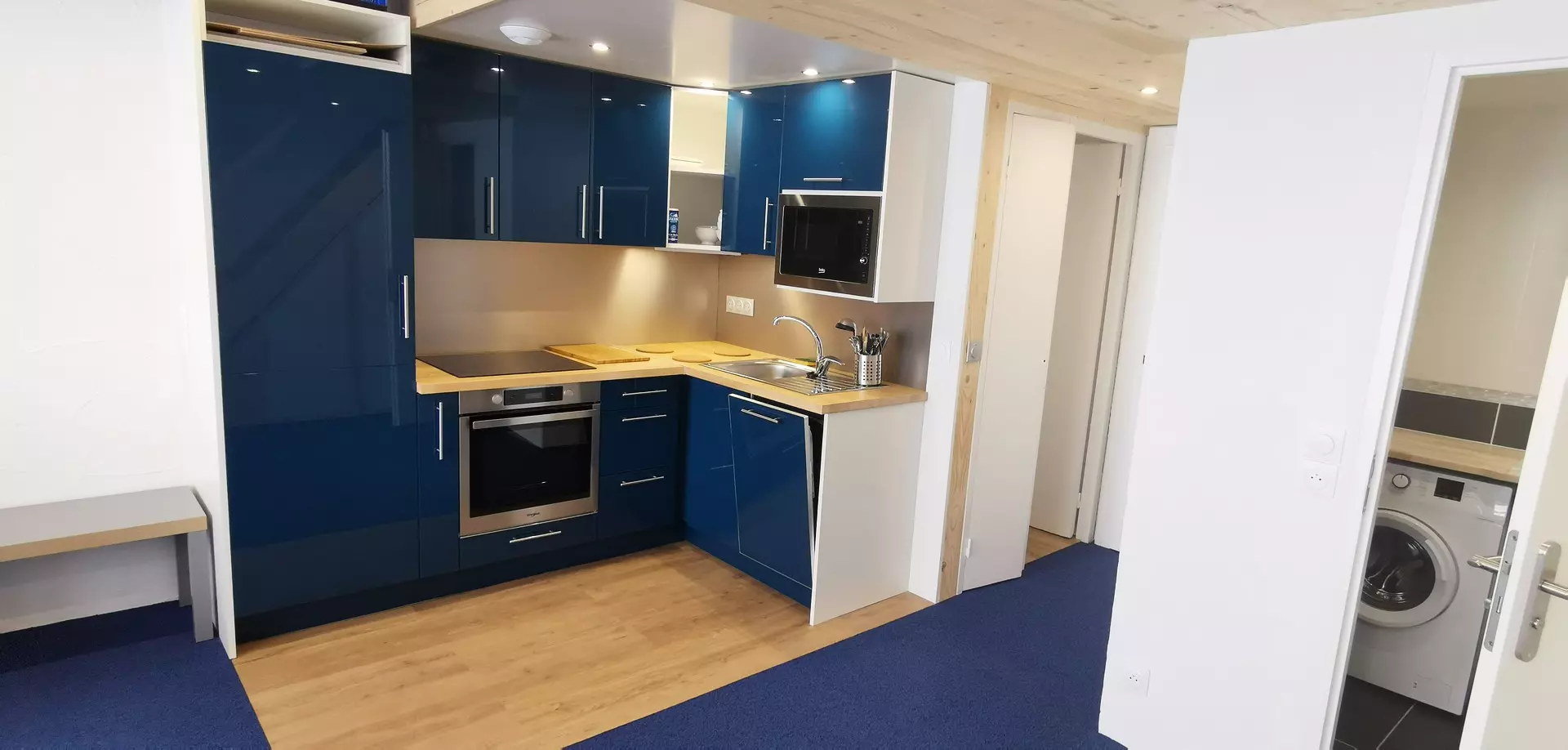La cuisine ouverte sur le séjour est équipée de 3 plaques électrique, d'un mini four, d'une four à micro-ondes, d'un réfrigérateur, d'un lave-linge, d'un grille-pain, d'une cafetière et d'une bouilloire.