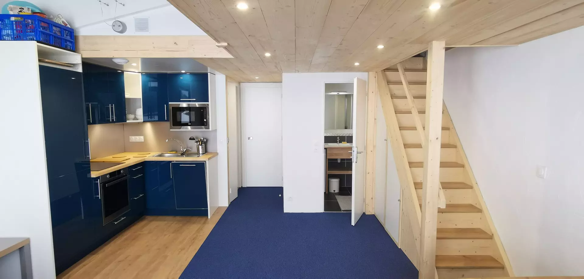 Il se compose d'un espace de vie aux matériaux raffinés, composé d'un canapé lit 3 couchages (individuels en 80x190), d'une grande table, un grand dressing et une cuisine entièrement équipée avec 3 plaques à induction, un réfrigérateur, un four, un four à micro onde, une machine à café Krups, service à raclette et fondue.