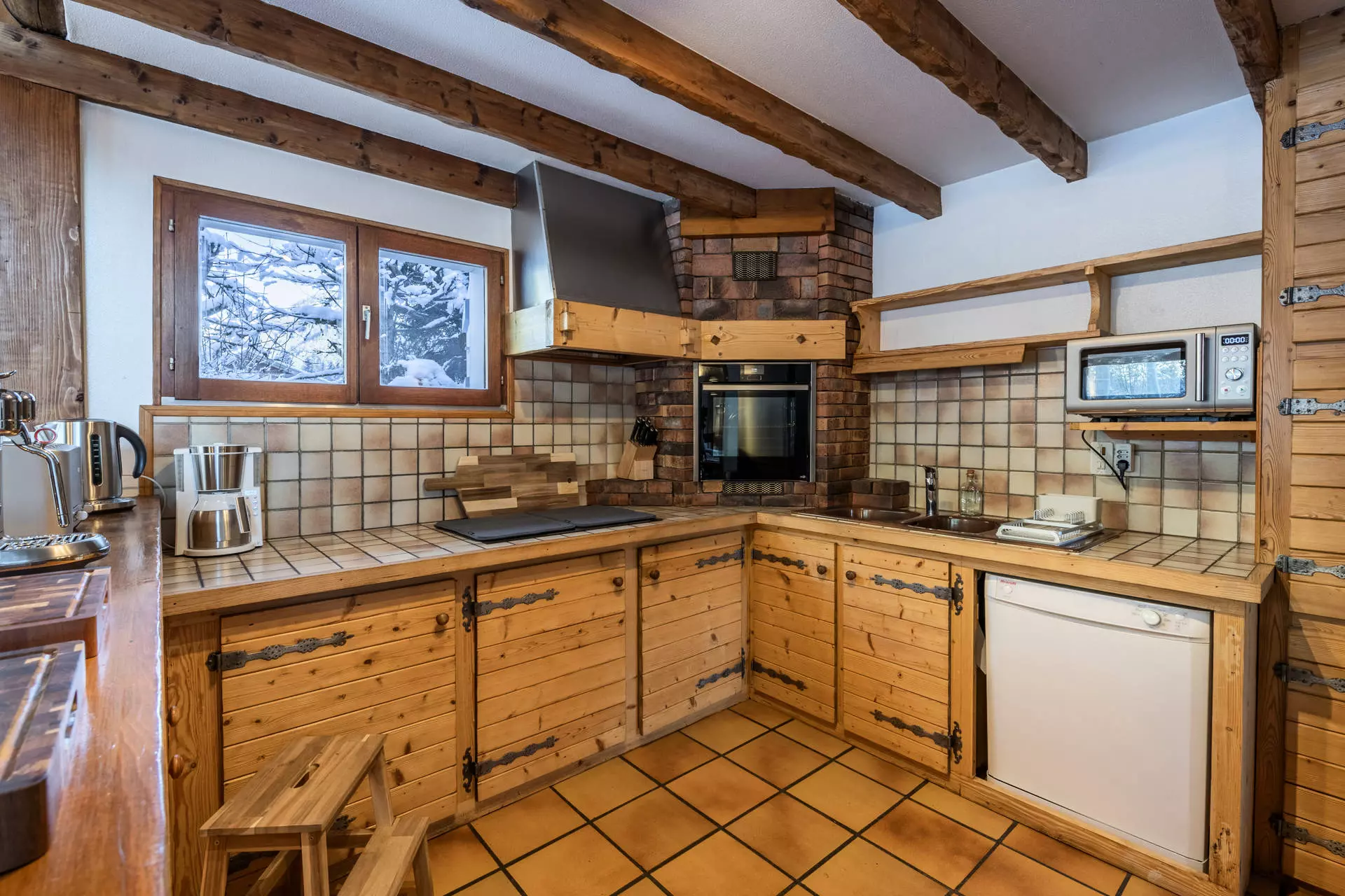- Cuisine ouverte équipée (plaques induction avec hotte, lave-vaisselle, micro-ondes, four, 2 réfrigérateurs + congélateur, cafetière, bouilloire, grille-pain)
