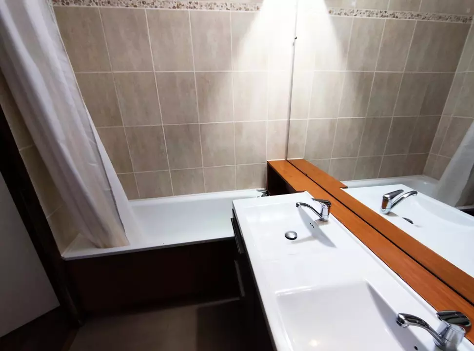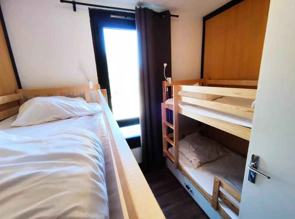 Composé de 3 chambres (2 avec lits 2 pers, 1 avec 4 lits superposés (réservés aux enfants, ne conviennent pas aux adultes)), 1 salle de bains, 1 salle d'eau WC, WC séparés, salon et kitchenette. Balcon sud.