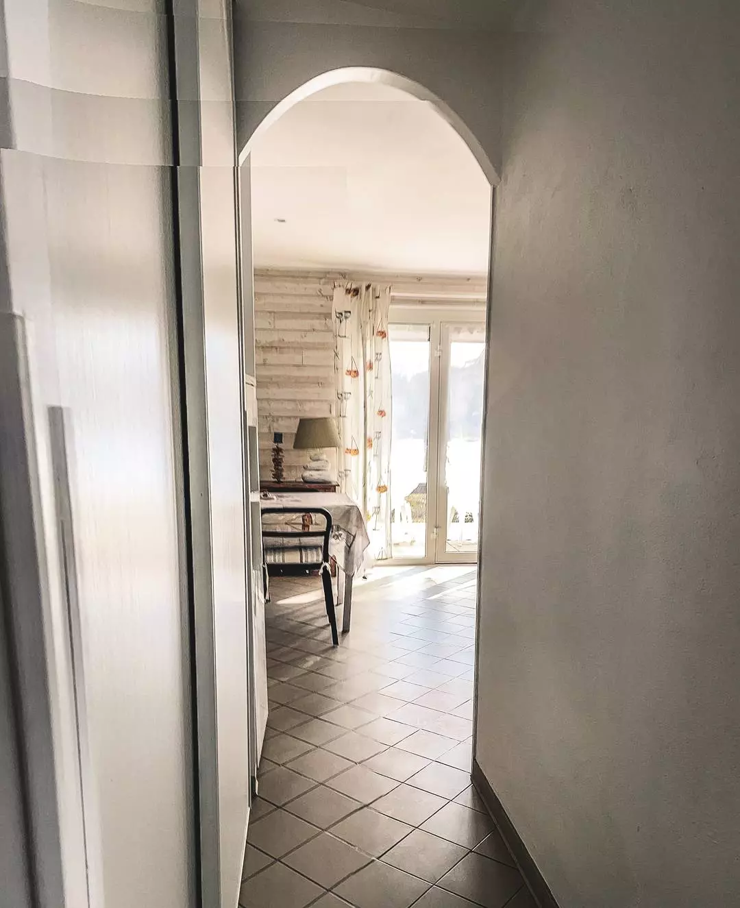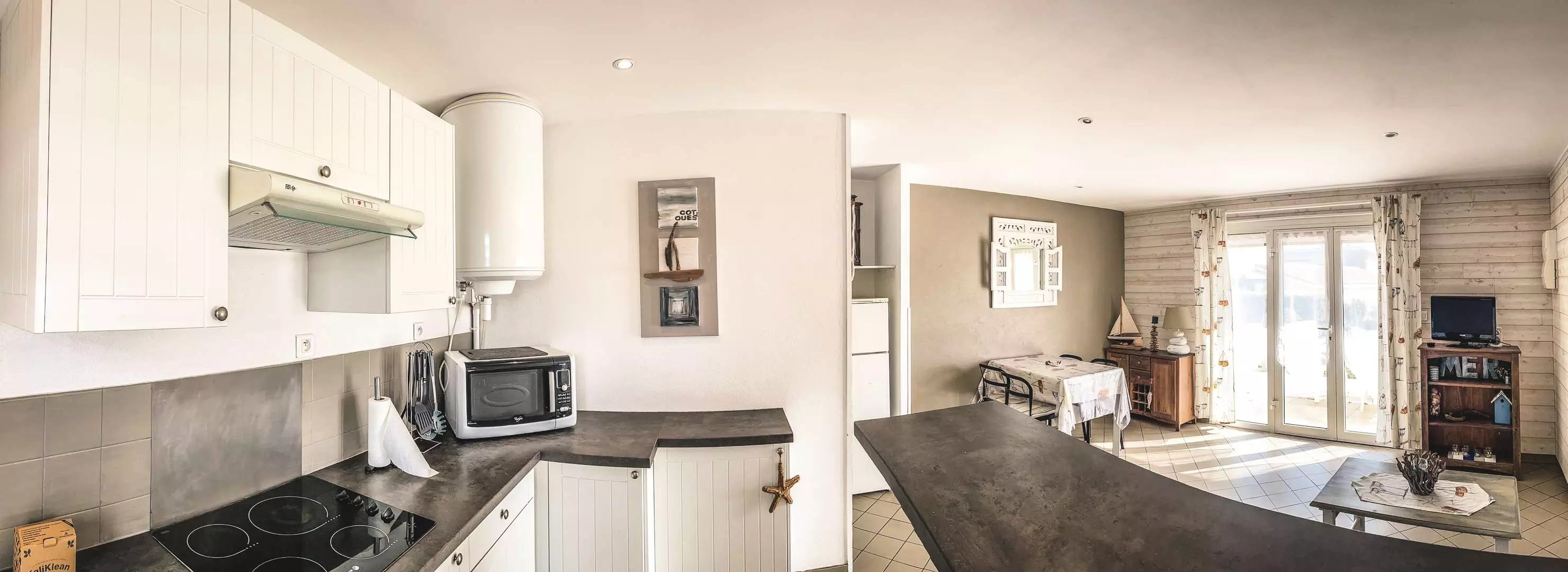 Pièce principale avec coin cuisine aménagée(2.26 x 3.2): plaque vitrocéramique, micro-ondes, réfrigérateur-congélateur et lave-vaisselle. Salle de séjour (4.7 x 3.8) ouvrant sur terrasse Sud: 1 canapé clic clac 2 personnes.