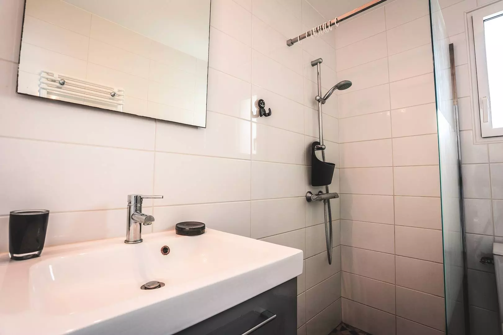 Salle de douche (1.43 x 2.05): douche, lavabo et WC.