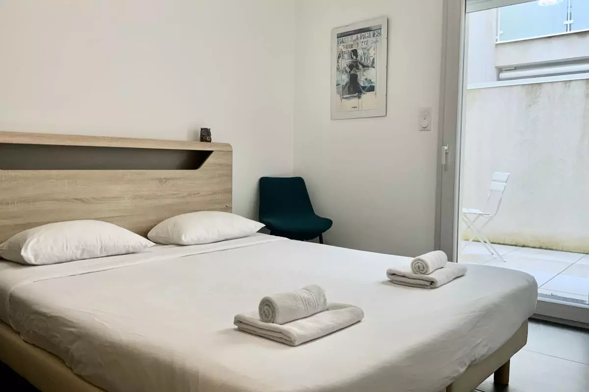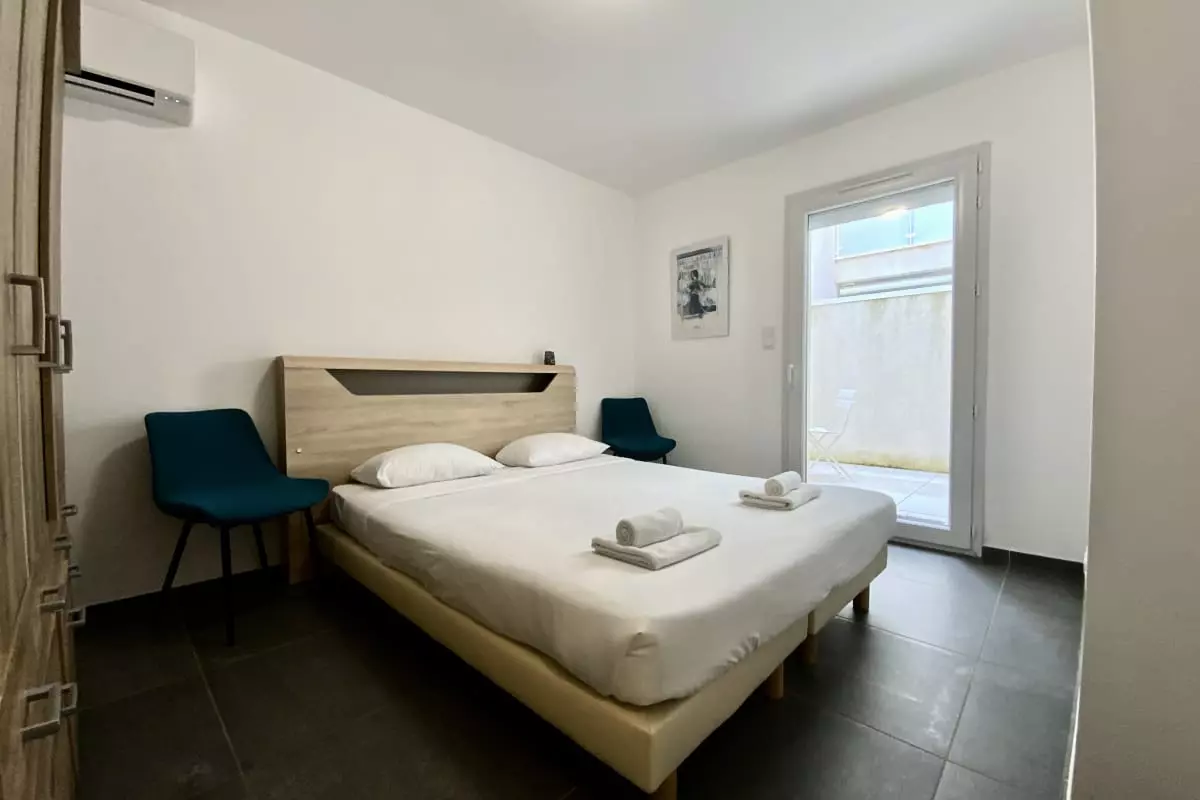Appréciez le calme et reposez-vous dans la chambre chaleureuse à la décoration épurée.