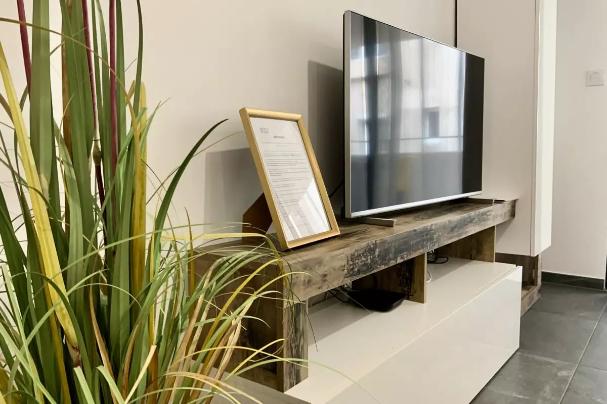 La pièce de vie est spacieuse et moderne, avec un canapé convertible, une TV.