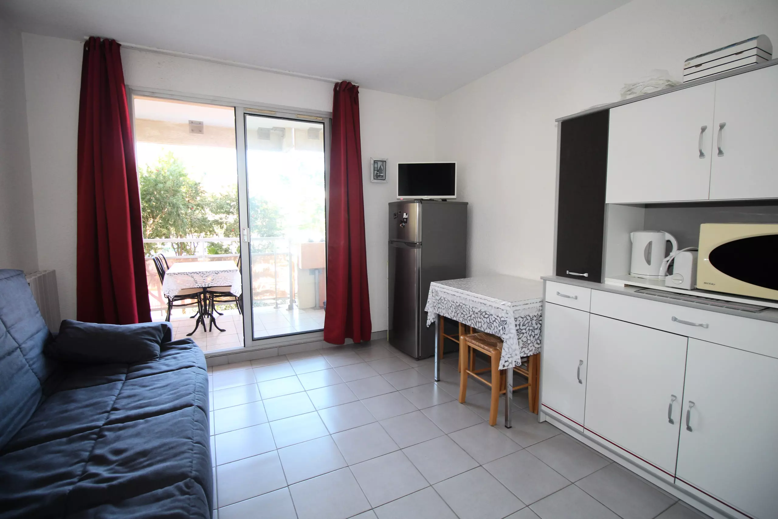 Ce studio de 20 m² vous offre une entrée avec un coin nuit, un séjour avec cuisine ouverte et l'accès à la terrasse avec vue agréable sur les bateaux, une salle d'eau, et un wc séparé.