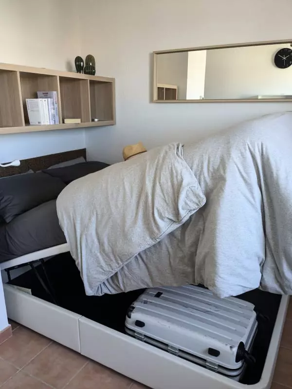 L’espace nuit est équipé d’un lit coffre en 140 x 200, optimisant le rangement. La salle de bain dispose des éléments essentiels pour votre confort. Côté cuisine, vous trouverez un micro-ondes pour la préparation de vos repas simples.