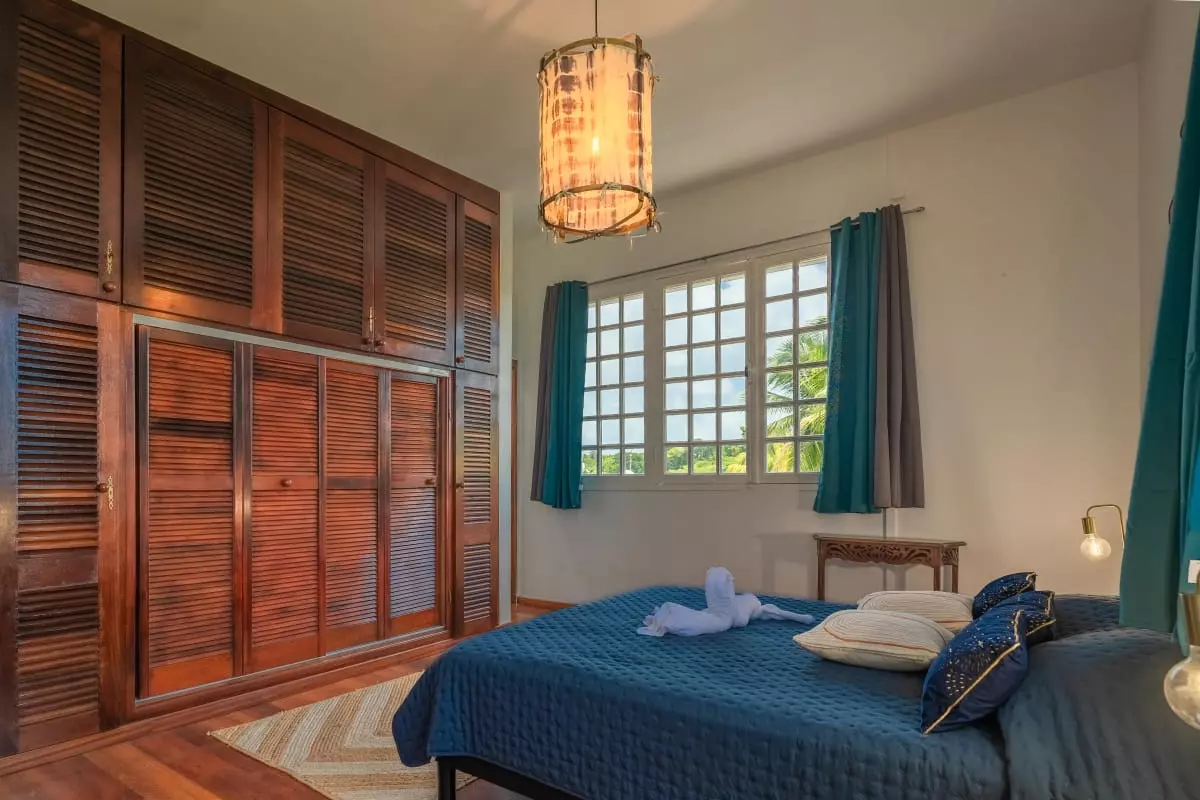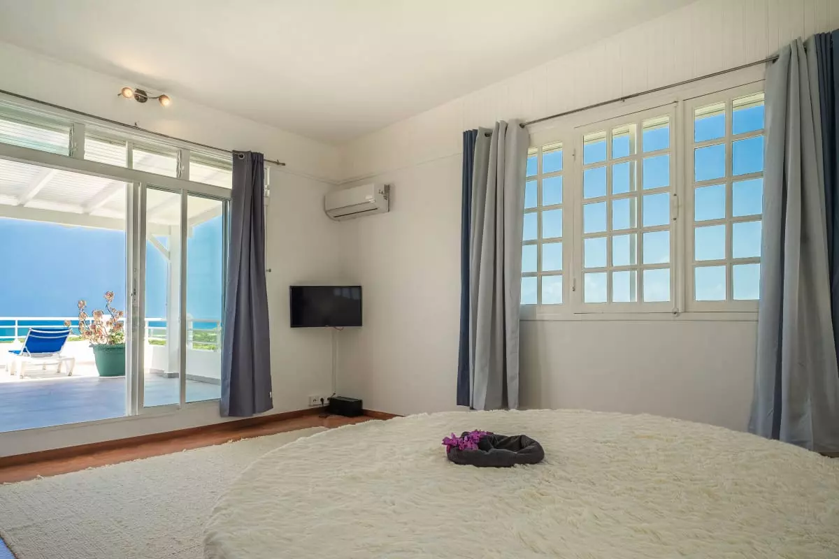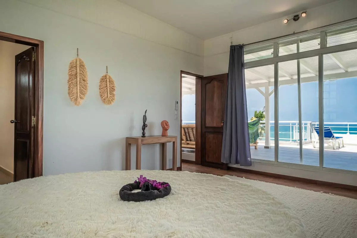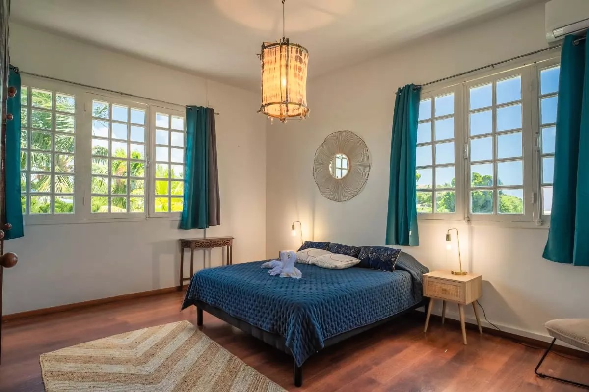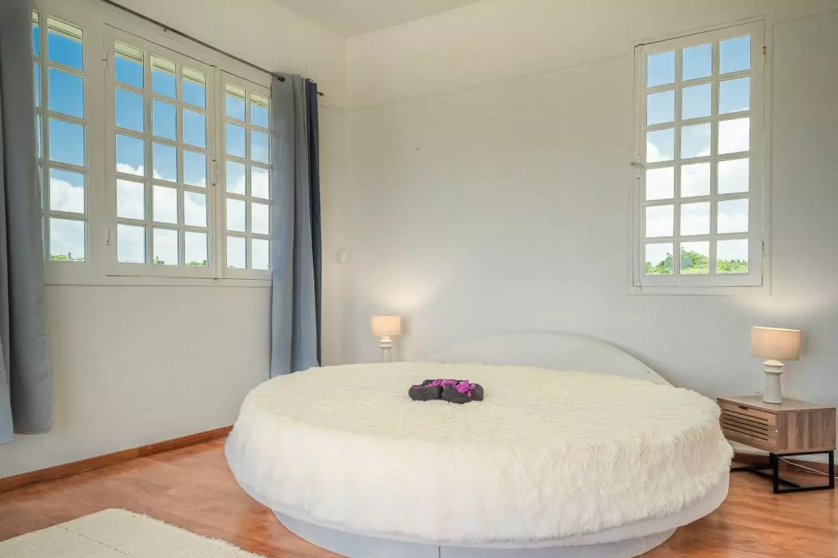 La villa Caïmite propose 240 m2 d'élégance répartis sur trois niveaux, pouvant accueillir confortablement jusqu'à 8 personnes. Ses quatre chambres sont aménagées avec soin : deux lits en 140 cm, un en 160 cm, et un grand lit rond vous attendent pour des nuits de sommeil réparateur. Trois salles de bain modernes et bien agencées garantissent confort et praticité, tandis que quatre WC assurent une intimité maximale.