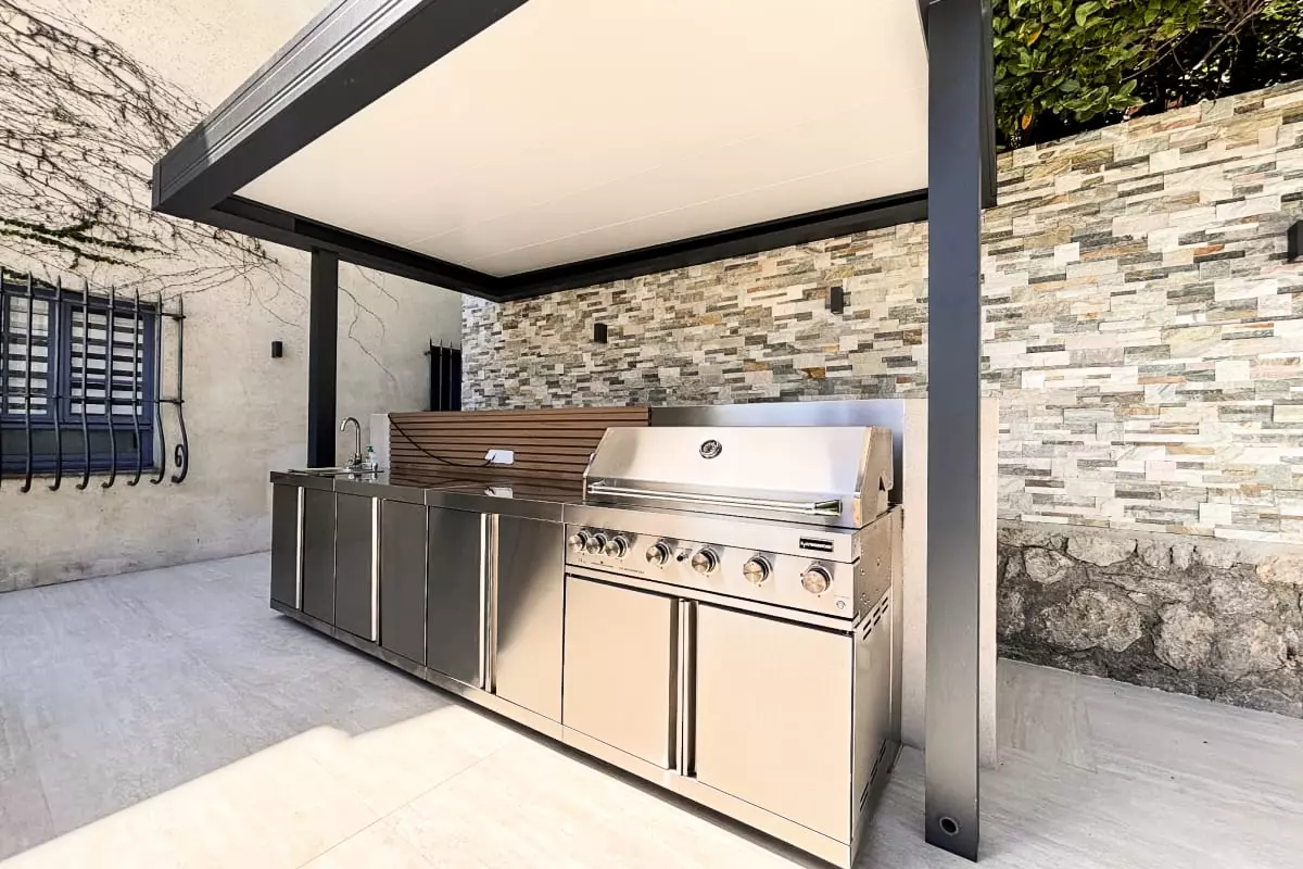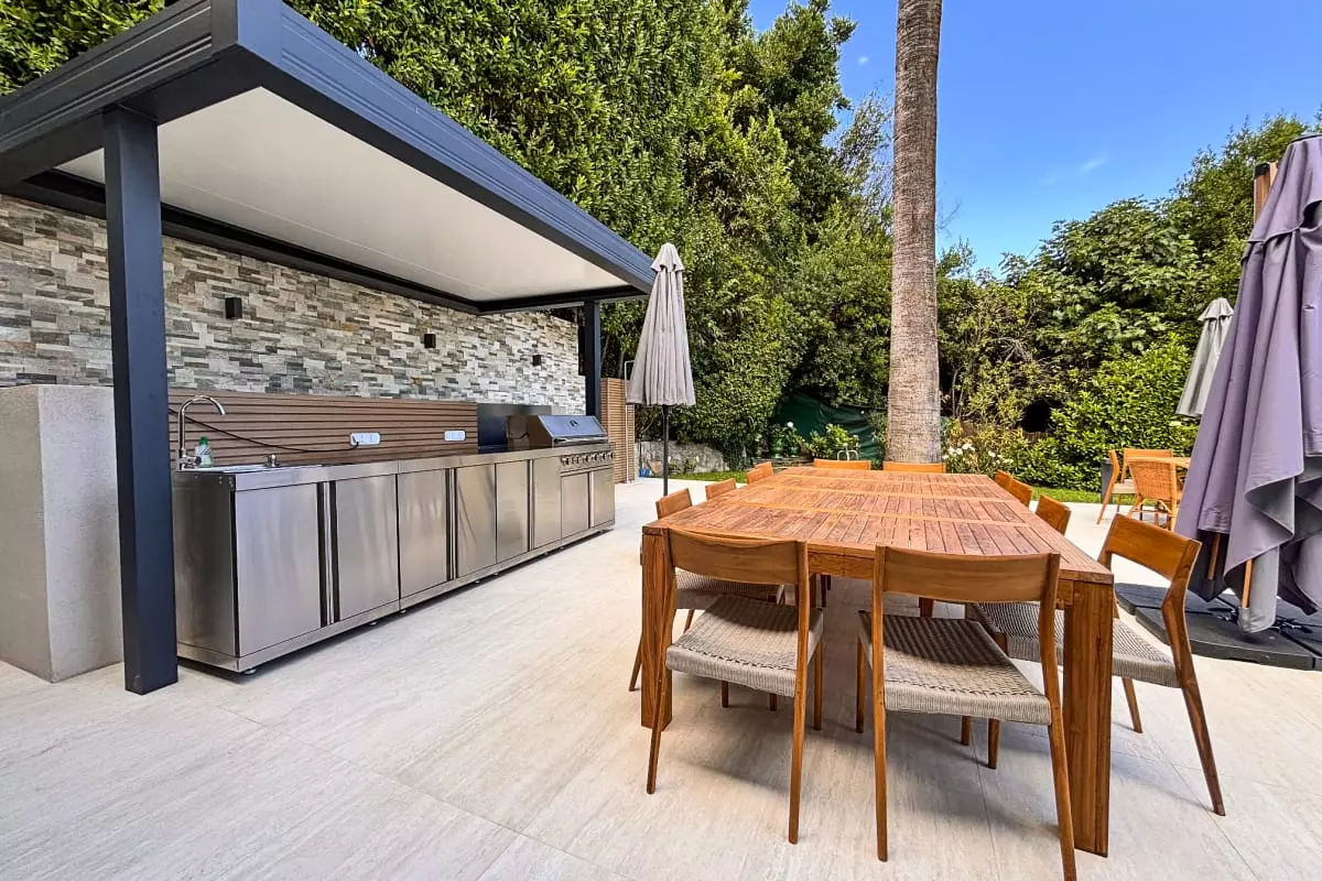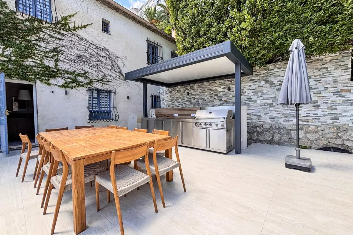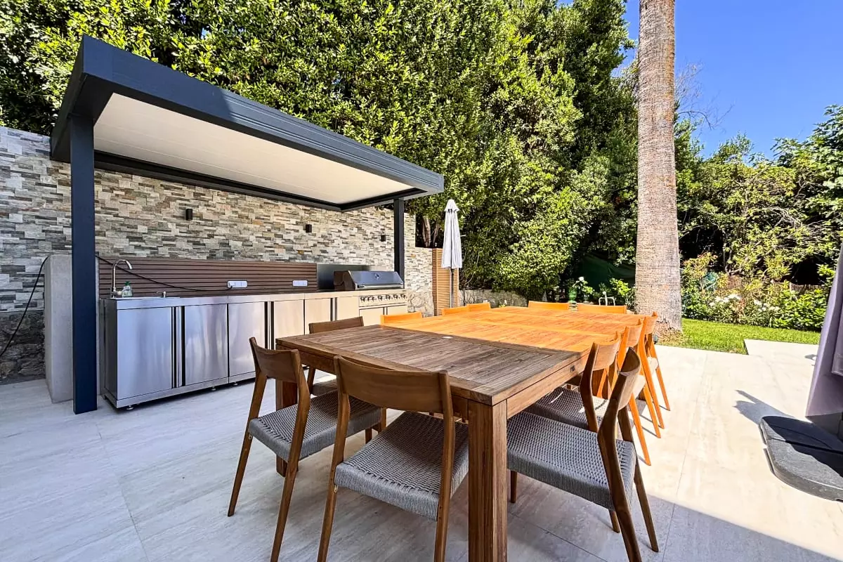 Vous profitez d'une piscine privative bordée de chaises longues et grandes terrasse ensoleillée avec salon de jardin espace repas avec une cuisine d'été et son barbecue à gaz intégré.