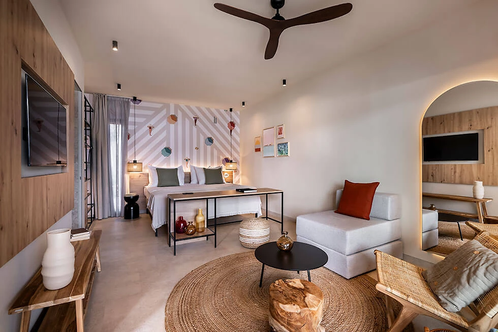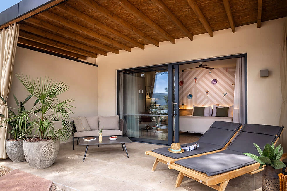 - Villa : (35 m², 3 à 5 adultes) avec terrasse équipée de chaises longues vue jardin, minibar, cafetière et four micro-onde