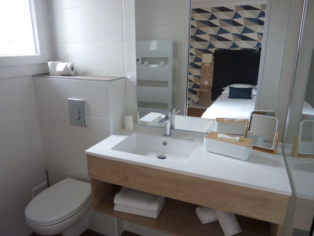 - Salle de bains avec douche, sèche-cheveux et toilettes.