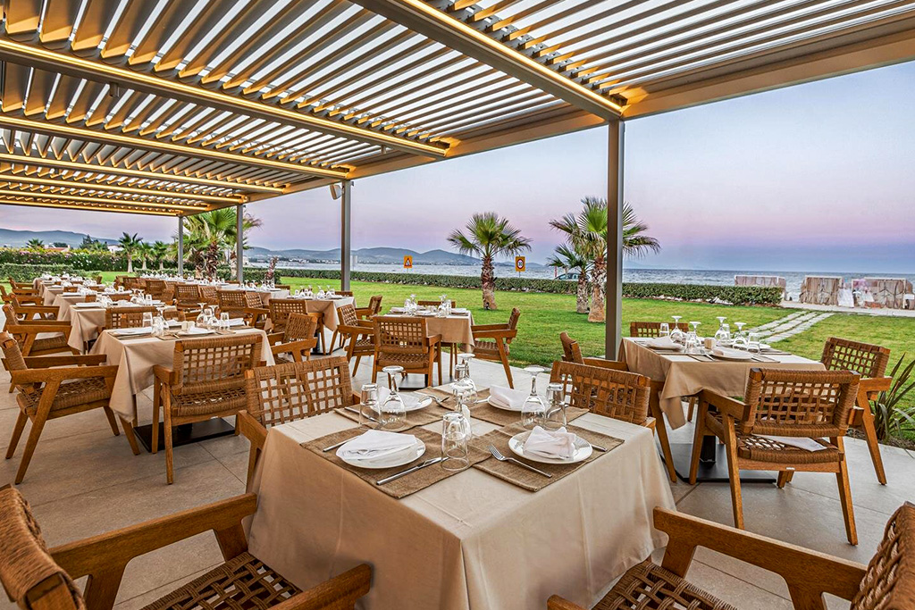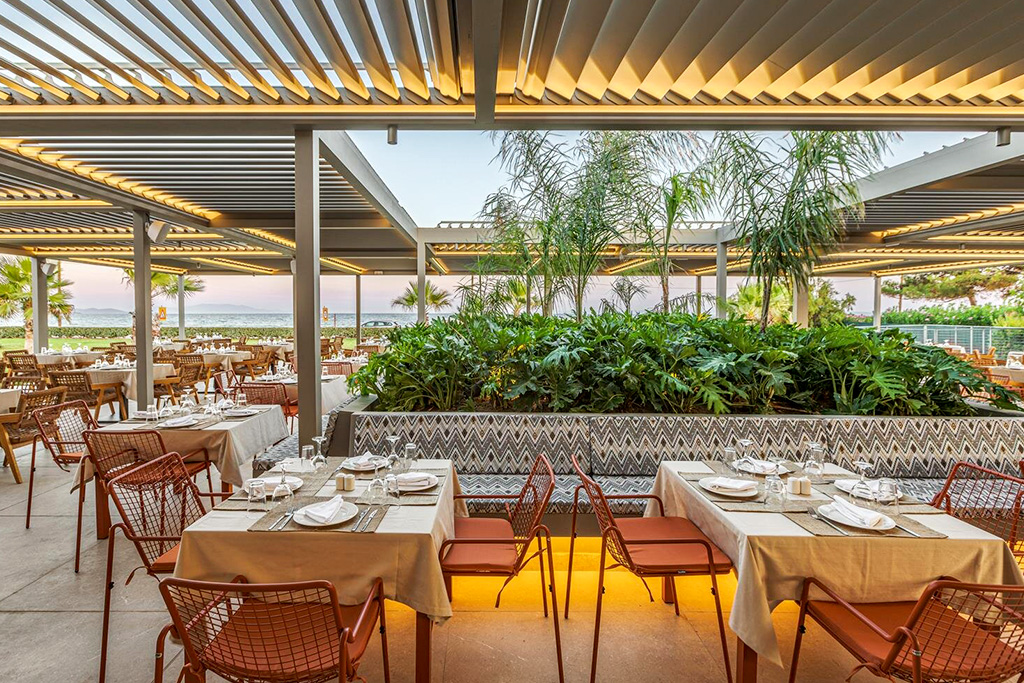 - Le restaurant « Amphitrite Sea Resto» dispose d'une agréable terrasse avec vue sur la mer et propose une cuisine grecque sous forme de buffet le midi et à la carte le soir. Un dîner par semaine est inclus dans la formule « Tout compris ».
