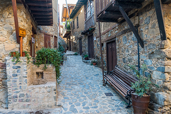 Balade à Kakopetria, un village renommé pour ses vieilles maisons restaurants dans le respect de l'architecture traditionnelle en pierres grises.