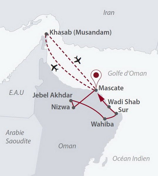- Les vols intérieurs Mascate / Khasab A/R sur Oman Air (horaires sujets à modification), bagage inclus.